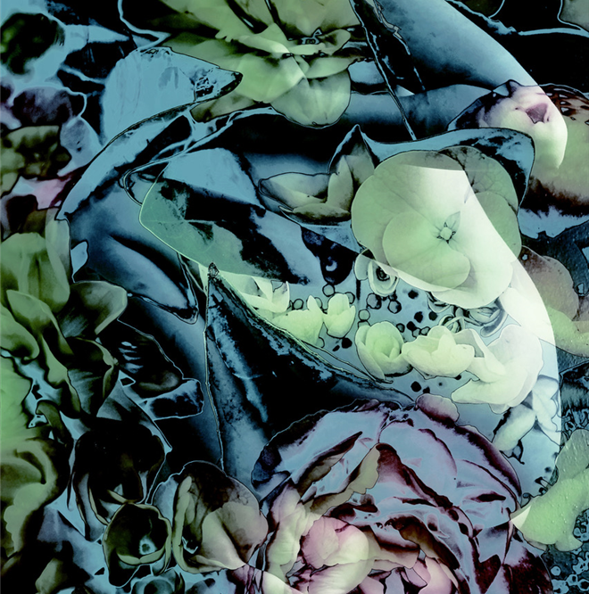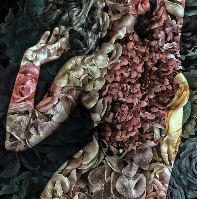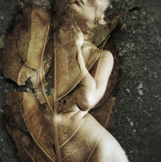 You have to look closely sometimes till the photograph releases a recognisable shape of a female figure hidden behind a veil of flowers or autumn leaves, a very special effect of blending images.