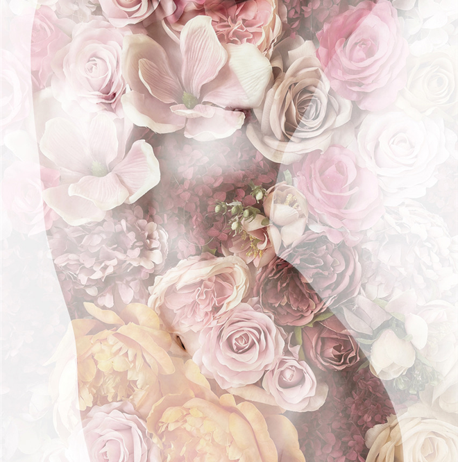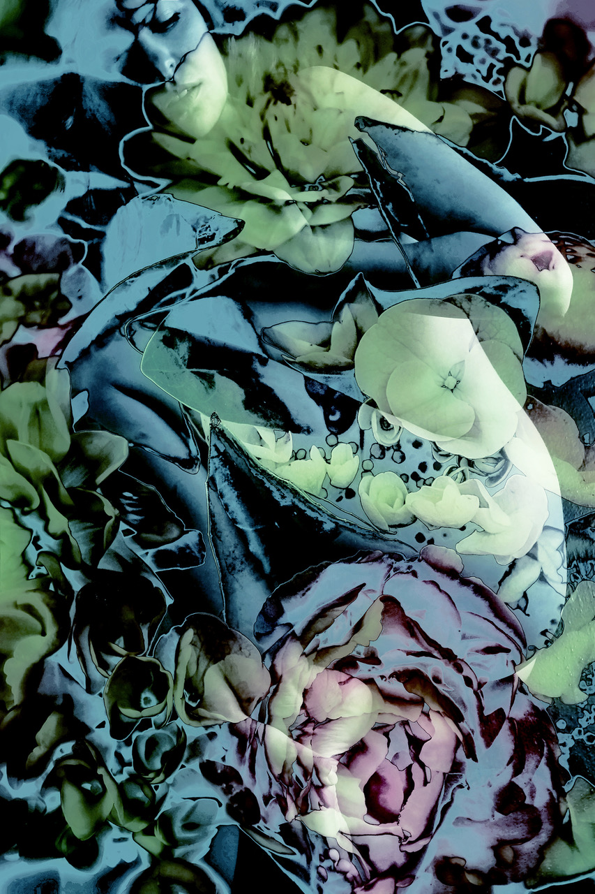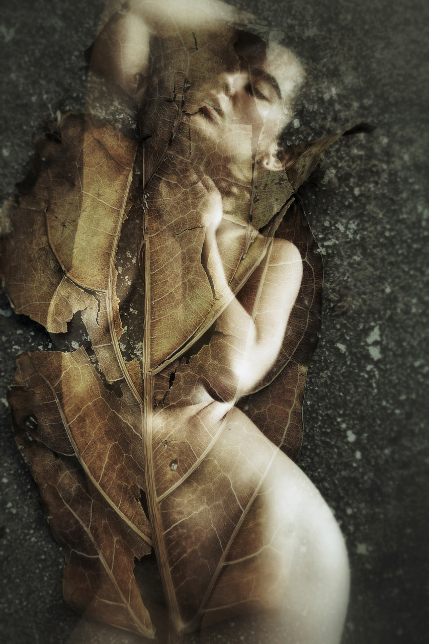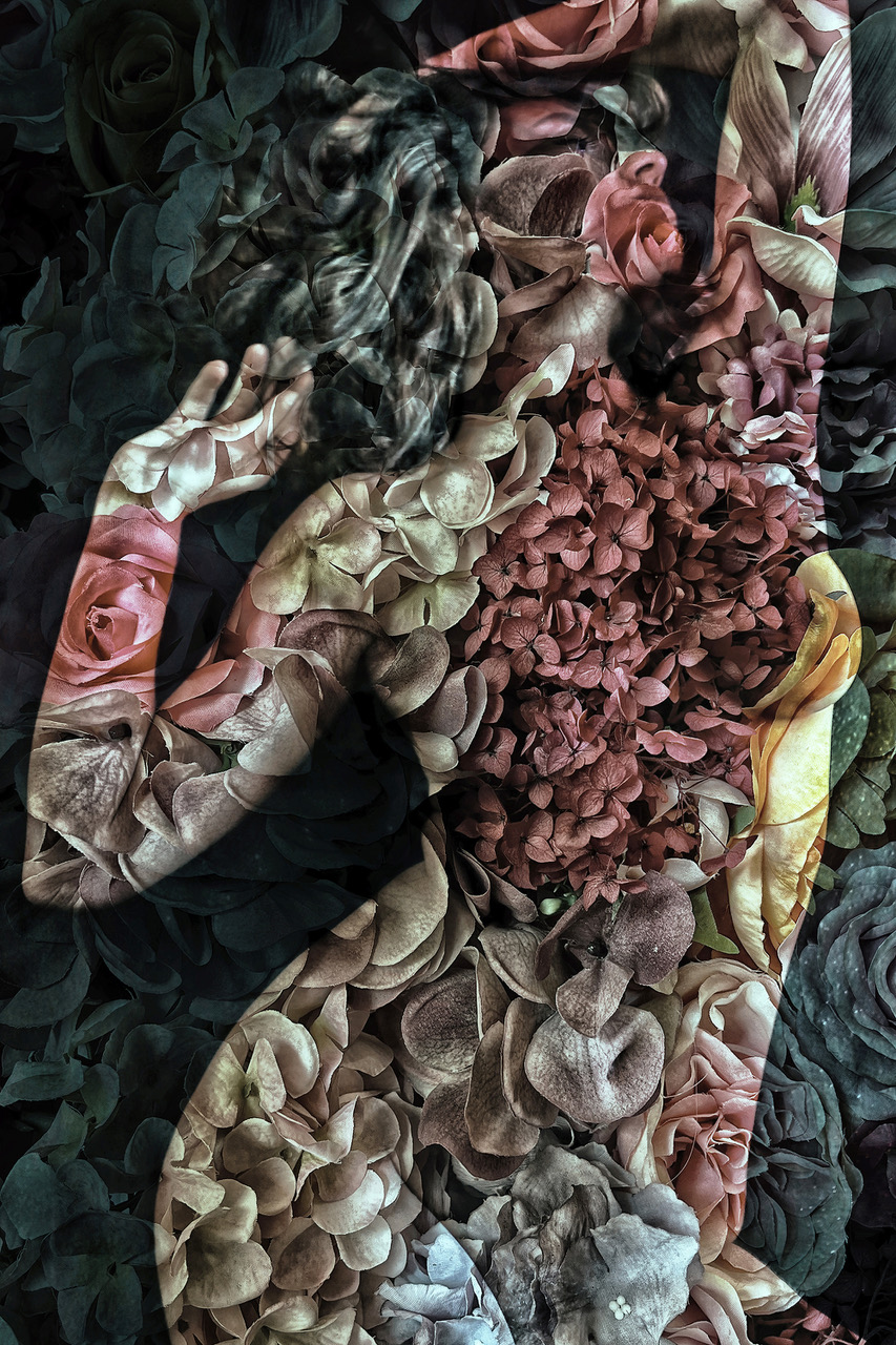 You have to look closely sometimes till the photograph releases a recognisable shape of a female figure hidden behind a veil of flowers or autumn leaves, a very special effect of blending images.